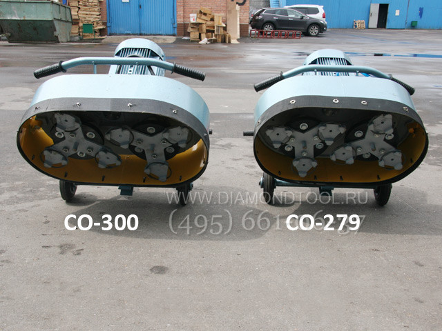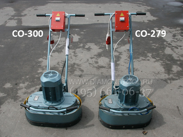 Мозаично-шлифовальная машина СО-300, состоит из шлифовальной головы и ходового устройства. Шлифование бетонных поверхностей производится шестью фрезами с алмазными сегментами, устанавливаемыми в державках на траверсах и удерживаемыми пружинными кольцами. В состав шлифовальной головы входит электродвигатель, установленный на цилиндрическом двухступенчатом редукторе с двумя выходными валами. На валах закреплены траверсы с абразивными или алмазными фрезами.