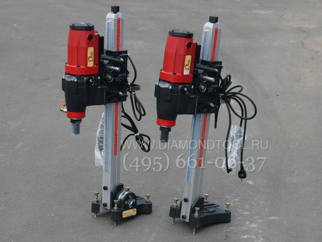В этой модели мощный 2500 Вт-й двигатель в сочетании с прочной стальной стойкой обеспечивает надёжную и стабильную работу на протяжении всего периода эксплуатации. Установка является быстроразборной, легкой в обращении. Есть возможность регулировки наклона без использования специального инструмента. Данная модель позволяет сверлить отверстия диаметром до 250 мм. 1 1/4" дюймовый соединительный хвостовик двигателя алмазной установки - подходит для алмазных коронок любых производителей.