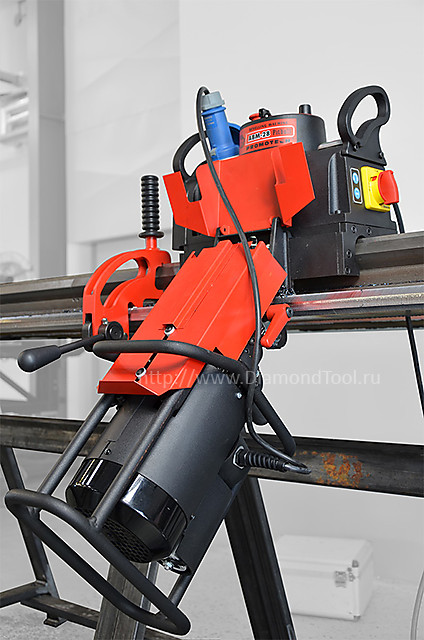 Мощный фаскорез Promotech ABM 28 с автоматической подачей и реверсом. Станок устанавливается на обрабатываемую деталь при помощи быстрых независимых захватов. Станок жестко закреплен на направляющей, которая крепко прижимается при помощи захватов. Скорость реза фаски составляет 350-500 мм в минуту. Движение станка в автоматическом режиме происходит плавно и оптимально быстро, исключая ошибки оператора. Фаска получается идеально ровная и гладкая. Основной особенностью данного станка является его возможность снимать фаску как сверху листа, так и снизу, то-есть под отрицательным углом, что сокращает время на переворачивание обрабатываемого листа.