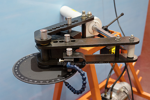 Гидравлический трубогиб с электроприводом HTB-1000 предназначен для изгибания круглых труб из металла или другого материала по заданному радиусу. Удобное управление гидроцилиндром и компактная гидравлическая насосная станция позволяют быстро производить гибку на нужный угол. Продуманная простая система рычагов, приводимая в движение гидравлическим цилиндром, развивает большое усилие гибки. Гибка трубы происходит вокруг штампа-шаблона, что обеспечивает точность изгиба трубы на заданный угол и с заданным радиусом. Максимальный угол гиба 0 - 120°, возможен гиб 0 - 240° на дополнительных штампах. Стандартный набор штампов позволяет изготавливать множество вариантов гибки труб различной конфигурации и в разных плоскостях.