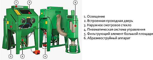 Цельнометаллическая сварная кабина с установленной на бункере системой формирования абразивовоздушной смеси, абразивоструйный аппарат, перчатки RGS-600 не требующие крепежа к кабине, пневматическая система управления, пускоостановочная педаль, фильтр воздушной линии, отдельно стоящая фильтр-камера DC-370, фильтрующий элемент, вакуумный рукав. Облицовка стен кабины. Автоматическая таймерная система очистки фильтрующей камеры.